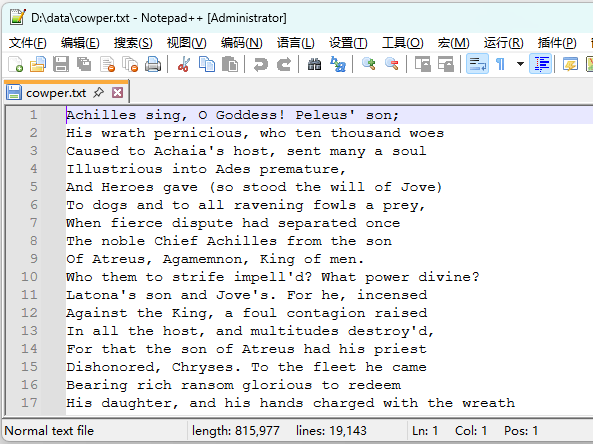 TextLineDataset接口读取指定路径下的文本文件(cowper.txt),构建了一个按行存储的数据集。随后,代码调用take(5)方法从中截取前 5 行数据,并通过循环将字节流解码打印。输出结果展示了《伊利亚特》译本的前五行诗句,最后的日志提示数据序列已读取完毕。