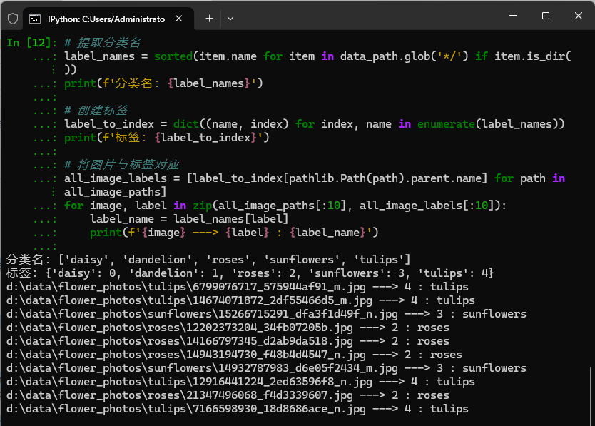 代码说明 :这段代码主要完成了图像数据的标签构建与验证。首先从数据目录中提取出5个花卉分类名称(如 daisy、roses 等),并按字母顺序排序后建立名称到数字索引的映射字典。接着遍历前10张图片路径,通过读取图片所在的父文件夹名称,从字典中查找对应的数字标签。最终打印图片路径、数字ID及分类名称,验证了数据与标签的准确对应关系。