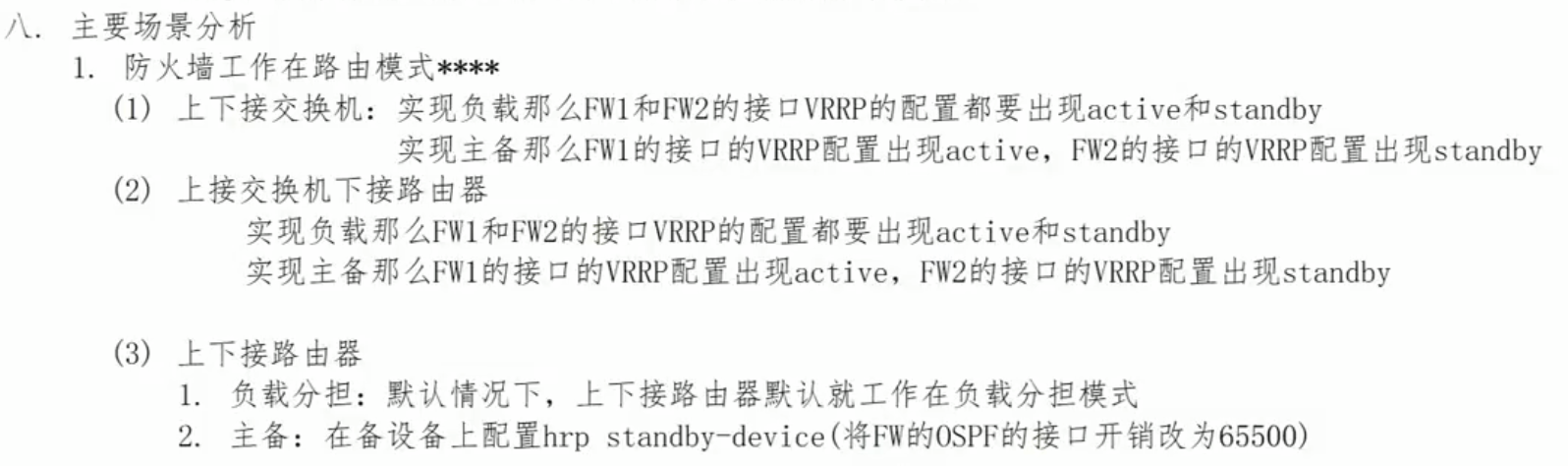 负载分担 :需要两组 VRRP(例如 VLAN10 和 VLAN20,或上行组和下行组)。FW1 在组 A active,组 B standby;FW2 在组 A standby,组 B active。两台设备的接口 VRRP 配置中都出现了 active 和 standby(因为每个设备上既有 active 的组也有 standby 的组)。这就是老师说的"FW1和FW2的接口VRRP的配置都要出现active和standby"。