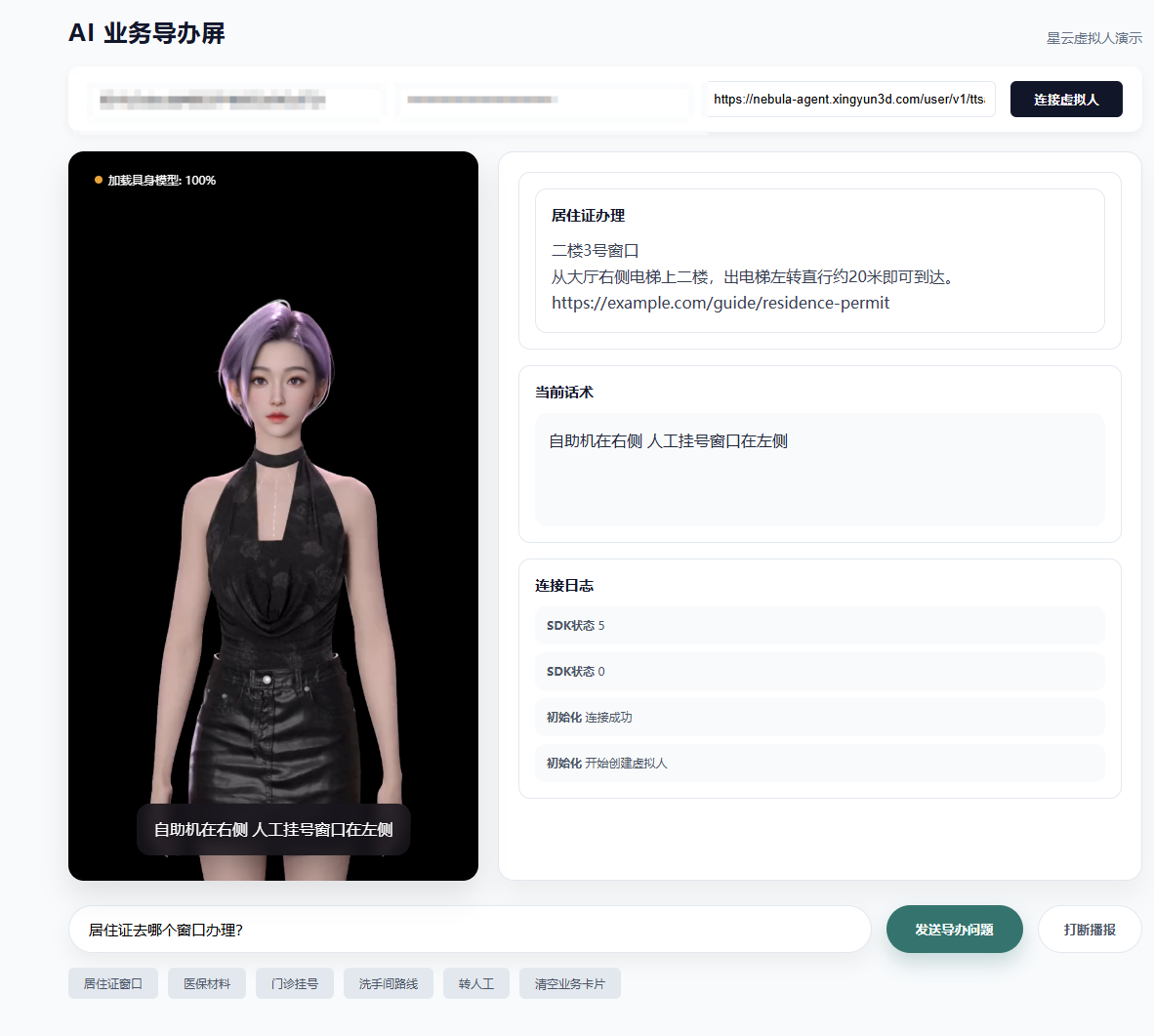 前端终端负责接入星云 SDK,完成角色加载、状态切换和界面联动。像 Idle、Listen、Speak 这样的状态,本质上就是在为连续交互场景服务。再配合图片、字幕、路线卡片等 Widget 能力,数字人的表达就能和业务信息同步出现。
