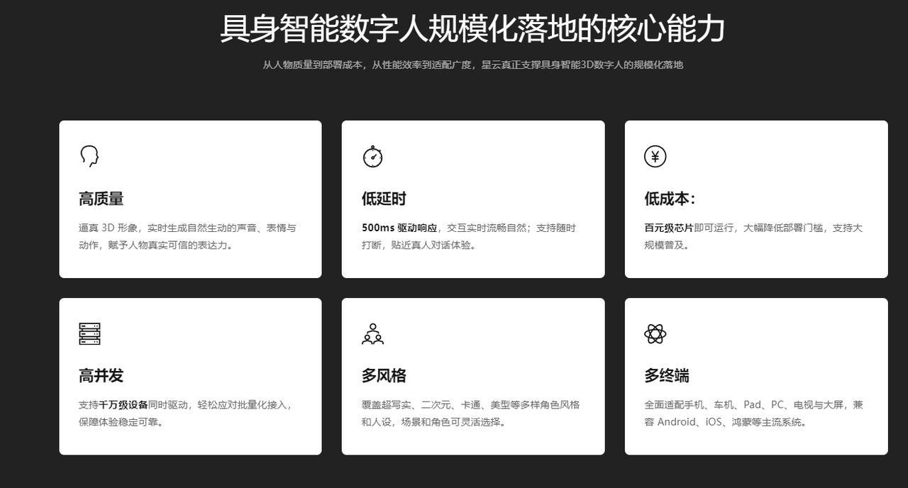 第三,部署成本更低。由于表达层更多放在终端侧完成,星云不必强依赖昂贵 GPU,百元级芯片即可运行。这让数字人不再只是少量高配设备上的展示项目,而真正有机会进入大量业务终端。