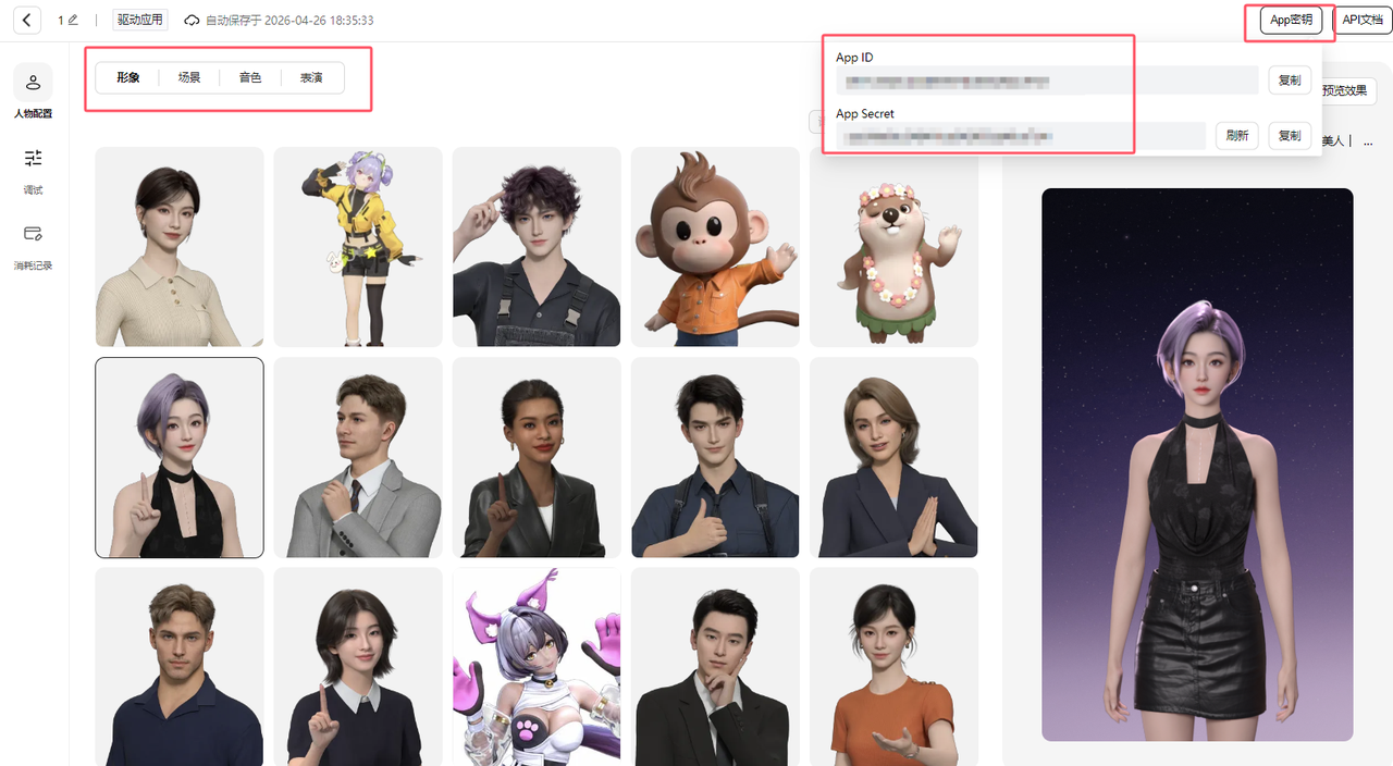 然后我们可以设置虚拟人的形象、场景、角色、表演动作,并谨慎保存好我们右上角的App ID和App Secret。