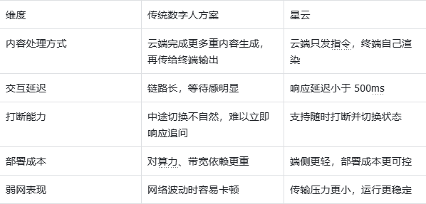 数字人这几年比较火,但真正进入业务现场后,很多方案并没有想象中好用。问题不在于形象够不够逼真,而在于交互链路是否足够轻、足够快,能不能真正承接服务流程。也正是在这一点上,传统数字人方案和星云的差别非常明显。
