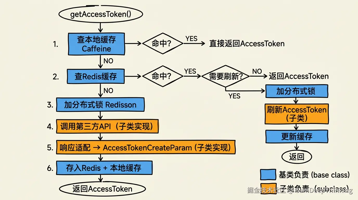 AbstractAccessTokenHandler是抽象基类,也是整个设计的核心。它定义了获取AccessToken的完整流程:查本地缓存、查Redis、加分布式锁、调第三方API、存缓存。这些步骤对所有平台都一样,全部在基类里实现。