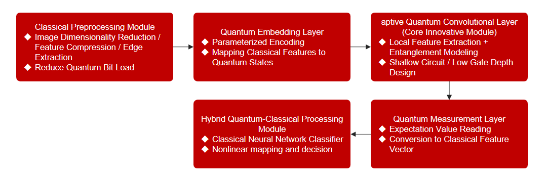 在输入阶段,模型首先引入经典预处理模块,对原始图像数据进行降维与特征压缩,该过程不仅降低了后续量子编码所需的量子比特数量,还有效减少了噪声对模型性能的影响。通过提取图像中的关键结构信息,如边缘、纹理以及局部模式,经典预处理模块将高维像素空间映射到更紧凑的特征表示空间,为后续量子计算提供更高质量的输入。