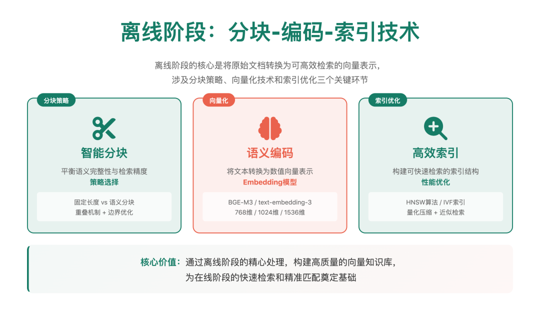 - 文本分块:将长文本分割成适合向量化的小片段(通常 100-1000 个 token)