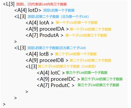 图中表示一个List类型中包含一个一般类型的数据和两个List类型数据,每个子List中包含多个数据