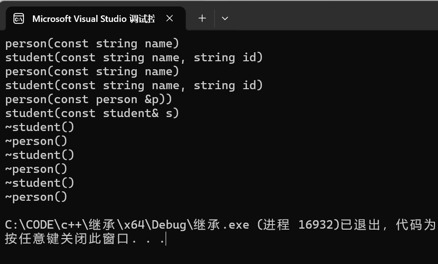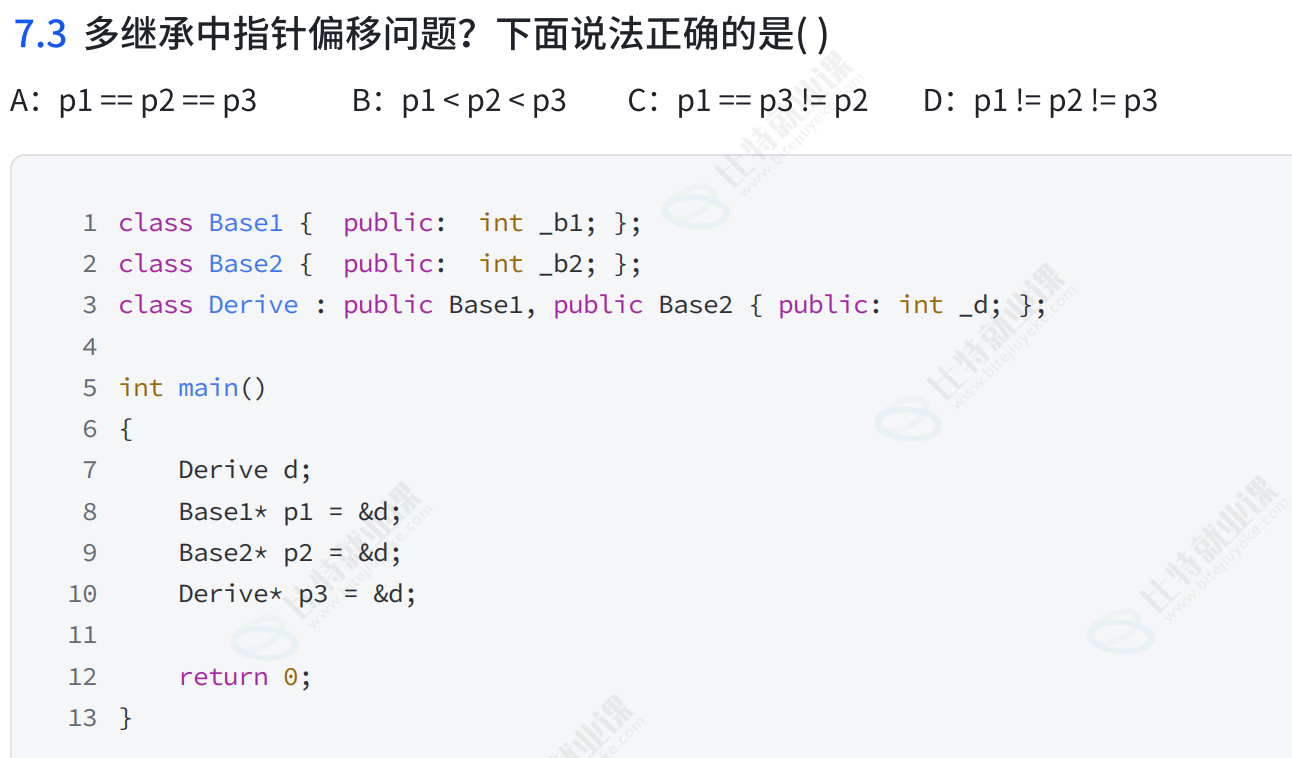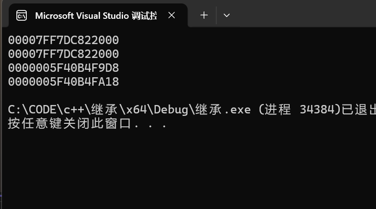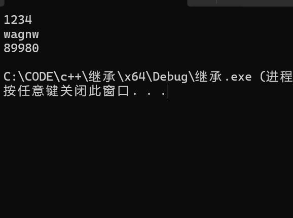 - 多继承:⼀个派生类有两个或以上直接基类时称这个继承关系为多继承,多继承对象在内存中的模型是,先继承的基类在前面,后面继承的基类在后面,派生类成员在放到最后面。