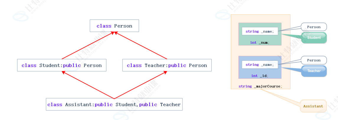 - 菱形继承:菱形继承是多继承的⼀种特殊情况。菱形继承的问题,从下面的对象成员模型构造,可以看出菱形继承有数据冗余和二义性的问题,在Assistant的对象中Person成员会有两份。支持多继承就⼀定会有菱形继承,像Java就直接不支持多继承,规避掉了这里的问题,所以实践中我们也是不建议设计出菱形继承这样的模型的。