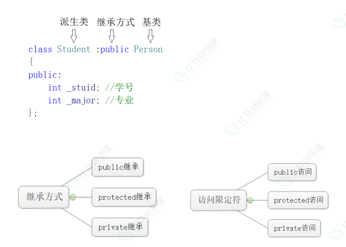 - 基类的私有成员在派生类都是不可见的。而且如果继承后的派生类,在类外想访问派生类的成员,按权限等级 public>protected>private,取继承方式 和 原成员权限 取更严格的那个,就是类外访问子类里的最终权限。