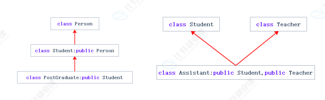 - 单继承:⼀个派生类只有⼀个直接基类时称这个继承关系为单继承