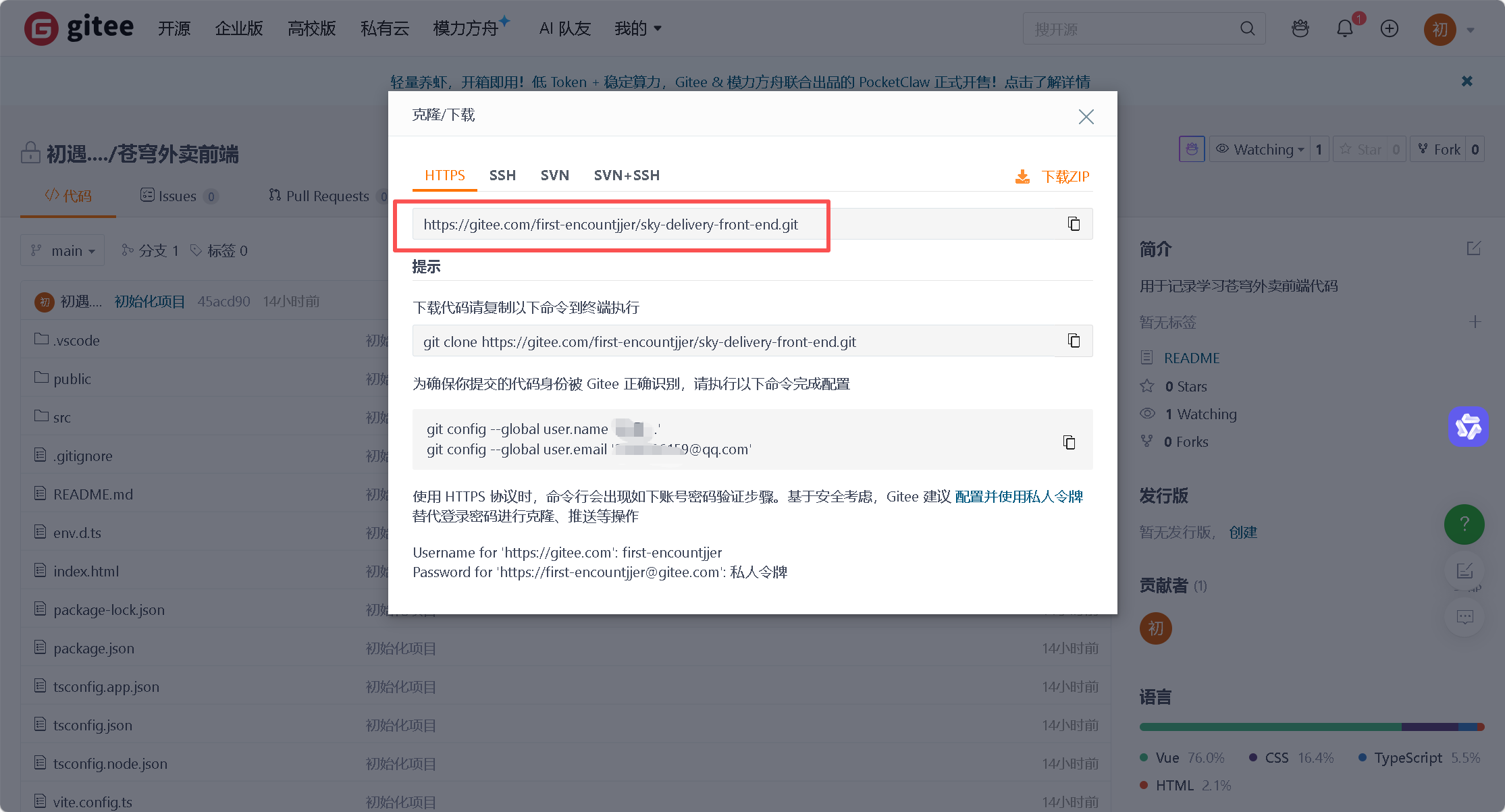(2)第一次 拉取需要验证登录,输入gitee的用户名和密码即可。