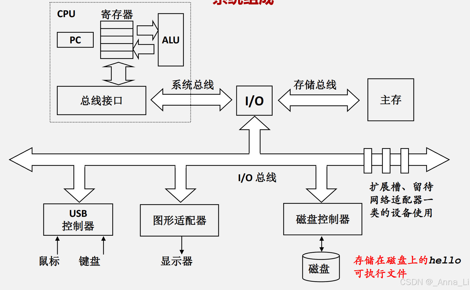#指令,文本替换和头文件展开)→ 编译(cc1,语法检查并翻译为汇编)→ 汇编(as,翻译为二进制目标文件)→ 链接(ld,符号解析并合并为可执行文件)。 - 系统硬件结构:CPU(PC + 寄存器 + ALU + 总线接口)通过系统总线和存储总线连接主存,通过 I/O 总线连接磁盘、键盘、显示器等外设。