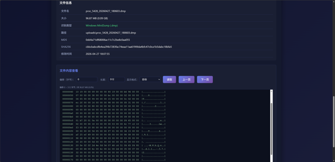 选择文件加载后,工具会自动分析出文件信息以及提供文件内容查看(下滑即能看到):