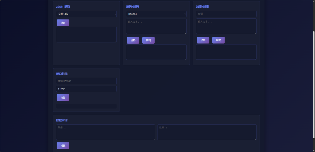 工具还提供了各类比赛等场景中可能用到的功能,如JSON 提取,编码/解码,加密/解密,端口扫描,数据对比,并将在后续更新中持续优化。