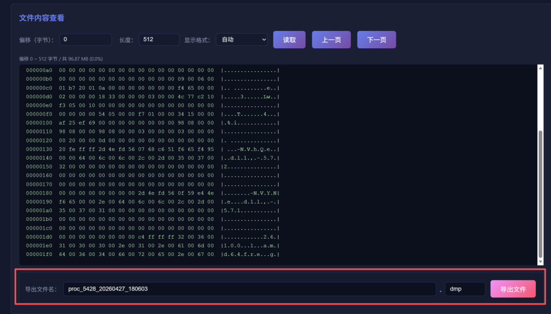 考虑到有的文件内容已被换页到磁盘不在内存中,这部分文件会显示提取失败,挨个分辨又会加大工作量,工具会自动检测哪些文件数据仍在内存中,哪些已被换页到磁盘