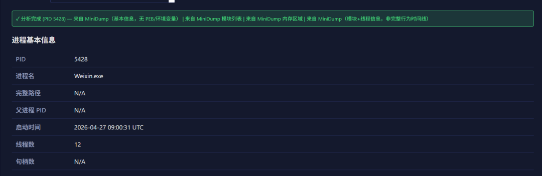分析后会展示,进程基本信息: