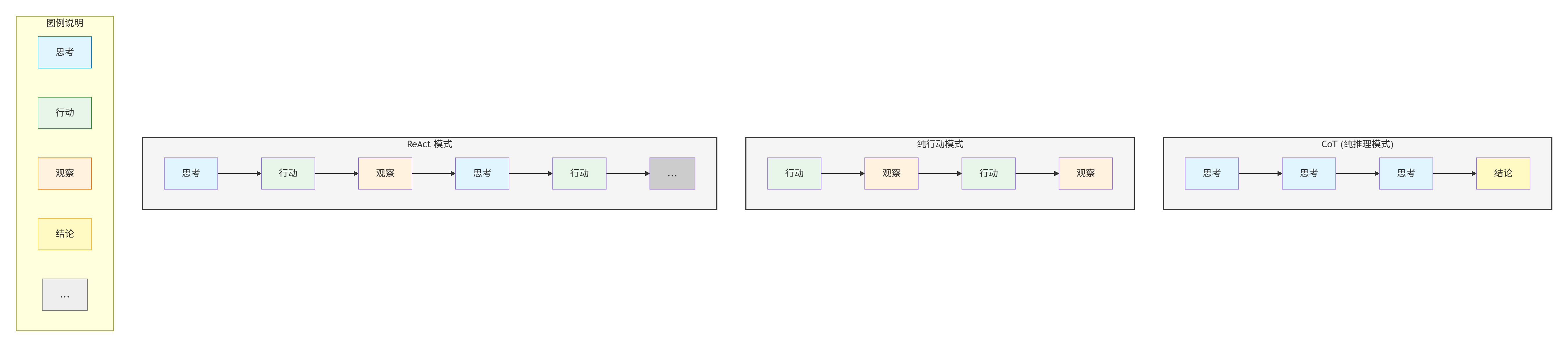 | 纯行动 | 行动→观察→行动→观察 | 信息丰富 | 缺乏规划 |
