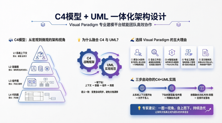 Visual Paradigm 为 C4 与 UML 提供一站式平台,确保:
