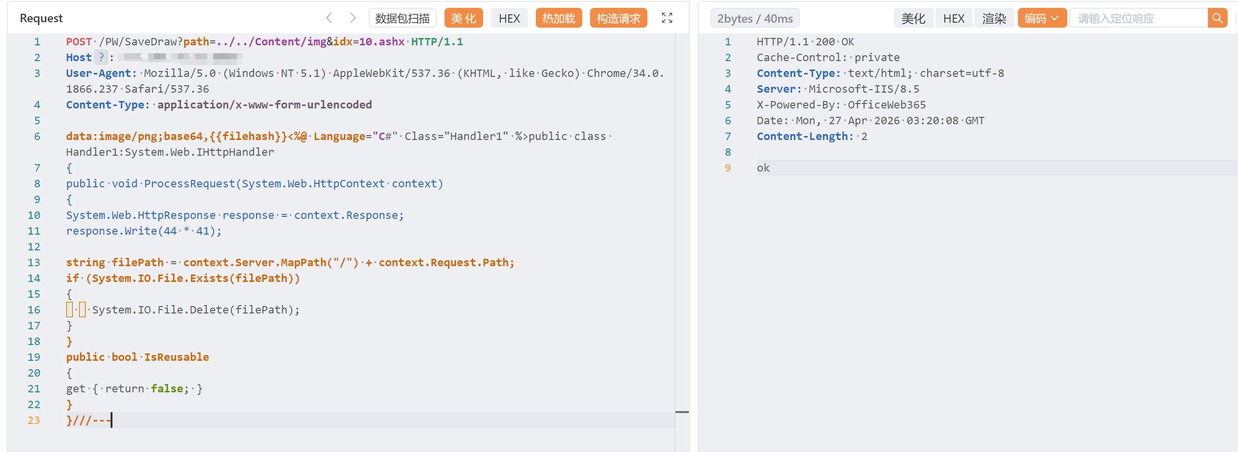 成功后,攻击者可通过访问 http://target.com/Content/img/UserDraw/drawPW10.ashx 执行上传的恶意代码。