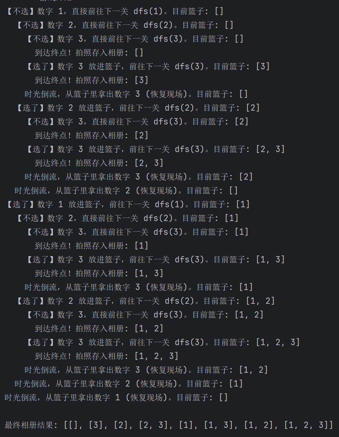 print(f"{indent}【选了】数字 {nums[i]} 放进篮子,前往下一关 dfs({i+1})。目前篮子: {path}")