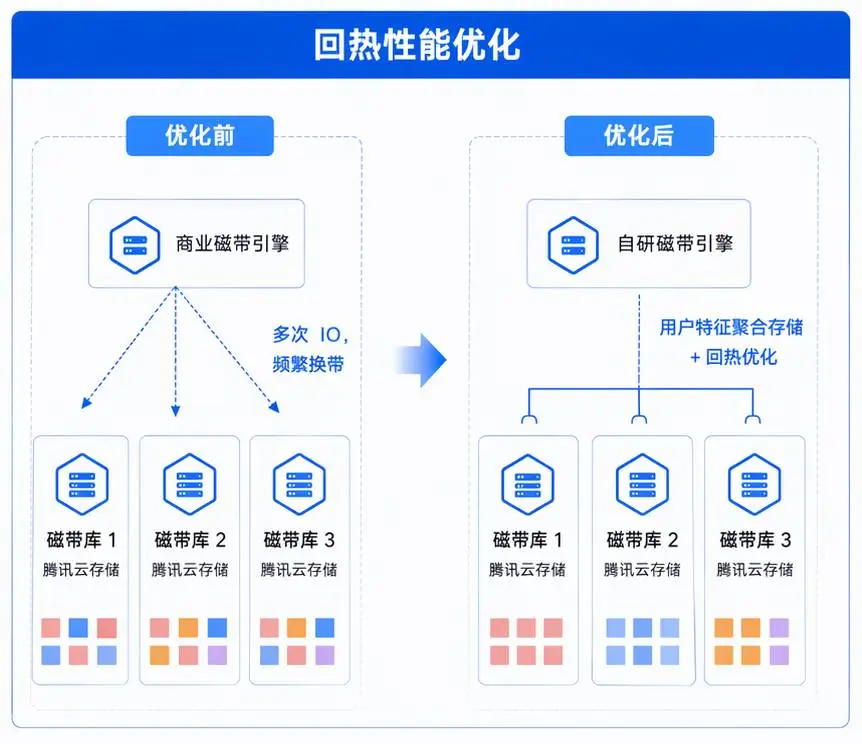 腾讯云基于自研磁带引擎提供了深度归档存储服务,打通了从数据沉降、磁带管理到数据回热的全链路,针对特定的工作负载进行"量体裁衣"式的磁带库优化,通过低冗余 EC 纠删码技术、智能磁带快速填充技术以及近实时数据聚类与回热聚合算法等技术手段,将存储密度做到极致,同时克服磁带随机访问的先天局限,将回热性能提升到可接受的水平。