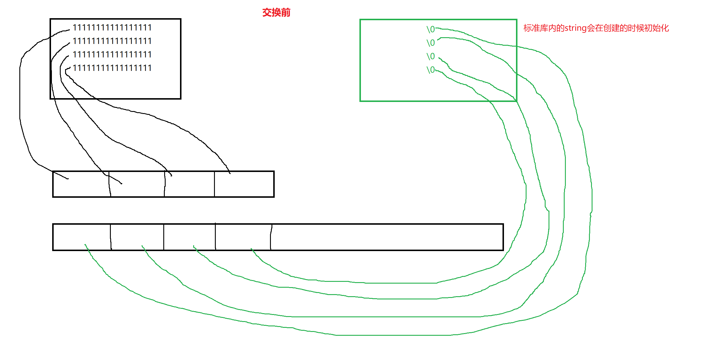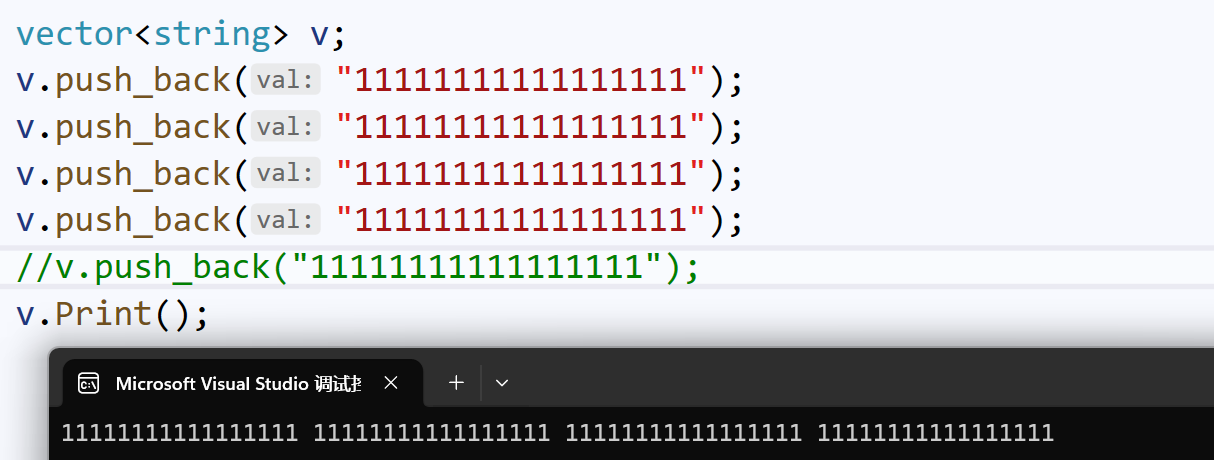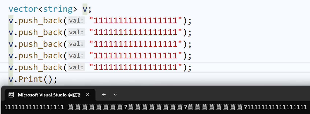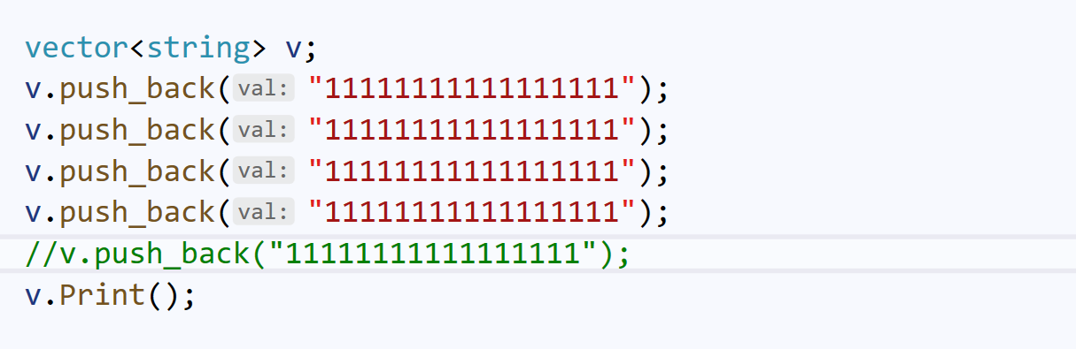 定义一个顺序表,里面每一个元素都是string类型;然后传入字符串(传入串的长度都大于16,以避免SBO优化)。