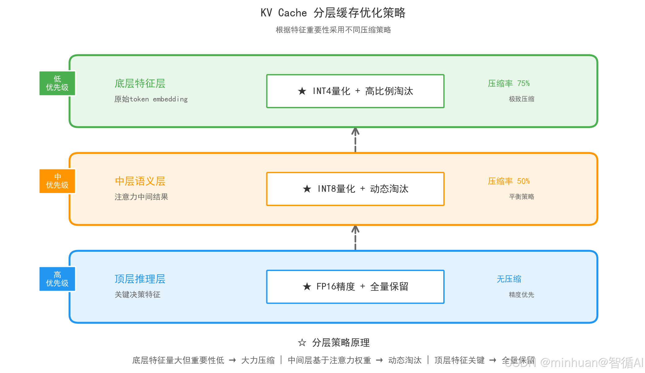 - 量化压缩写入:按层级精度要求,量化K/V向量后写入缓存;