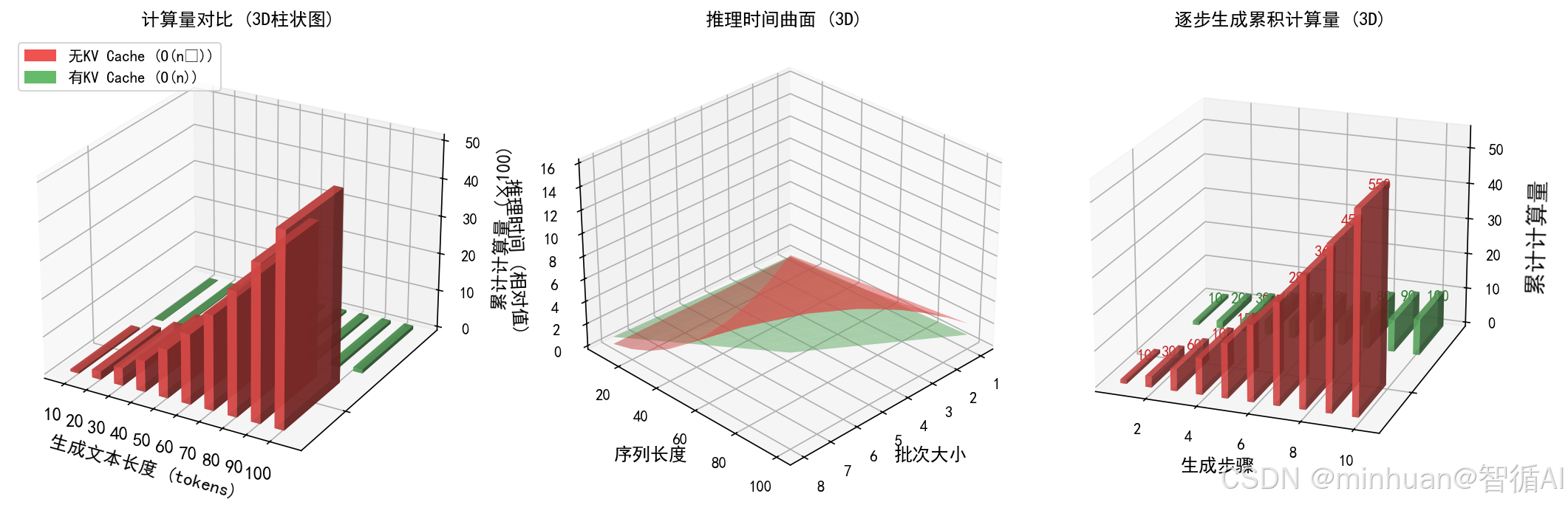 - 绿色: 有KV Cache时计算量随长度线性增长