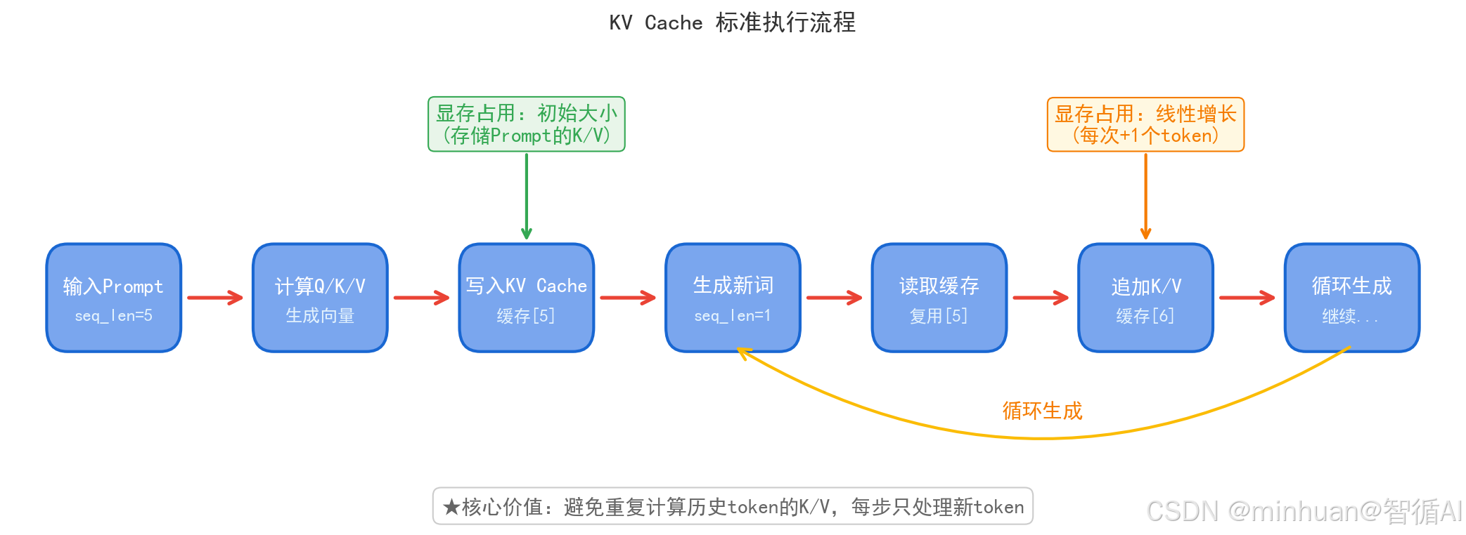 KV Cache 的标准执行流程,我们以"逐词生成"为核心,拆解KV Cache的标准执行步骤,这是所有优化技术的基础: