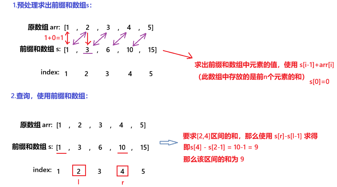 - 解释公式:前缀和数组中的每一个元素都是原数组arr中前 i 个元素的和,即求出原数组中前 i 个元素的和(从下标1到 i),放到对应前缀和数组中的 i(从1开始) 位置