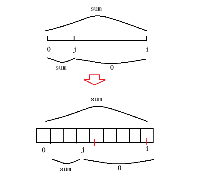 - 如下图,在和为sum的数组中,有一个也是和为sum的最短子数组,那么和为0的子数组的长度是 i-j+1,但是和为0的子数组并不包含 j 位置上的元素,因此长度计算: