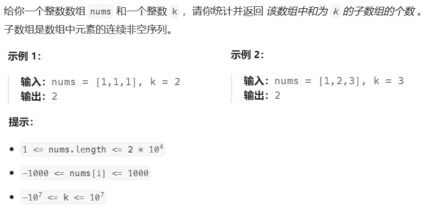 算法思路:此道题要求的是nums中和为 k 的子数组的个数,且根据提示,nums中元素可以是0或者是负数,因此这道题是不可以使用 滑动窗口 来解决的,没有单调区间,且由于可以是0或者负数,left和right指针中间的某一段连续区间还可能也是目标区间,但是right永远无法往回走。