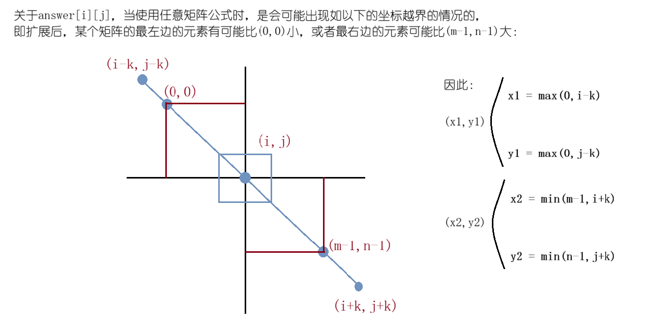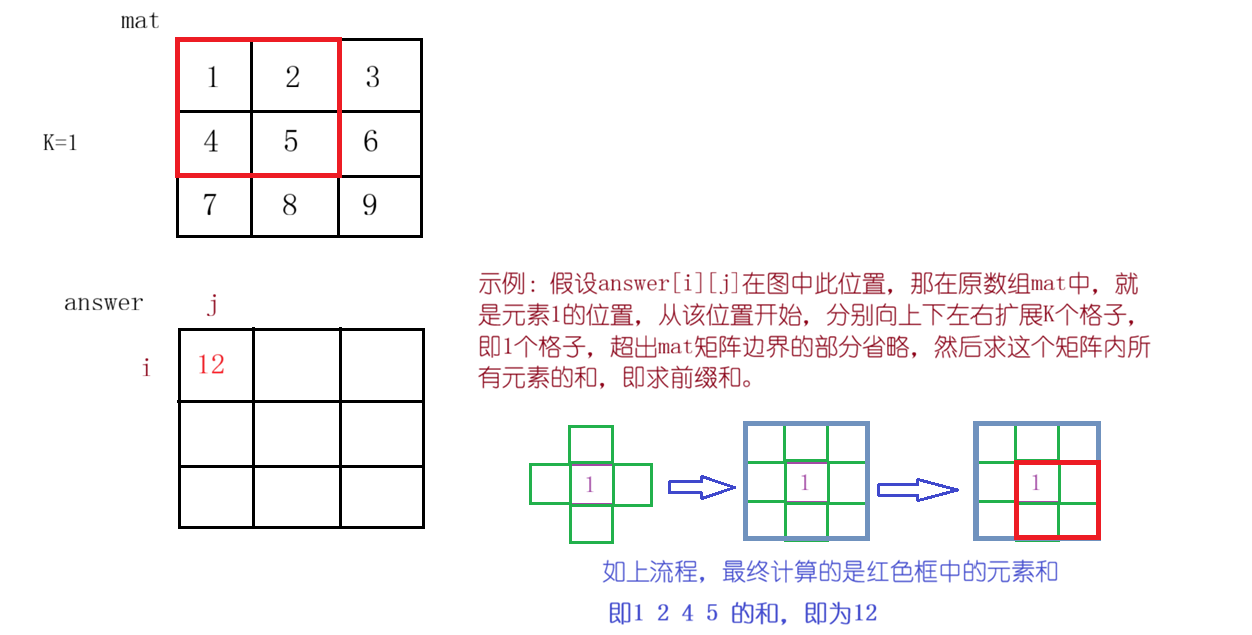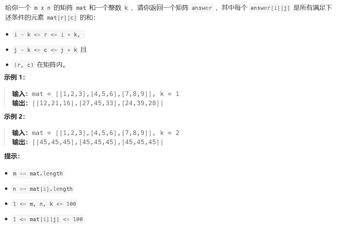 算法思路:翻译一下题目的意思就是:以 (i,j) 为中心,向上下左右各扩展 k 格,形成一个 "矩形区域",求这个区域内所有元素的和(超出矩阵边界的部分忽略)。