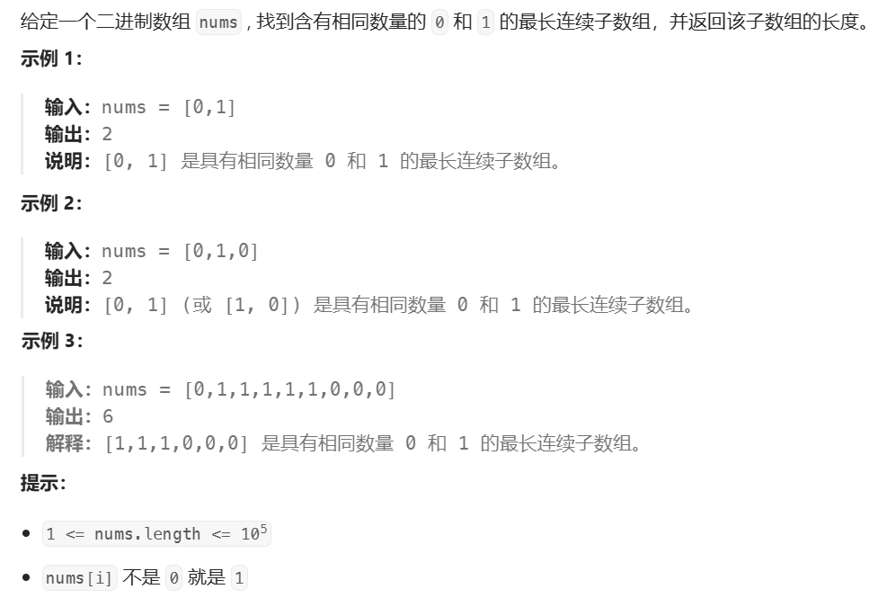 题目给了一个只有0和1的二进制数组nums,要找出0和1数量相同的一个最长子数组,我们可以转换思路:把 0 转化成 -1 ,即找出 -1 和 1数量相同的最长子数组,也就是和为0 的最长子数组 ,就相当于第5题的 和为k的子数组,因此,我们可以按照这个思路来做这道题 ------ 前缀和+哈希表: