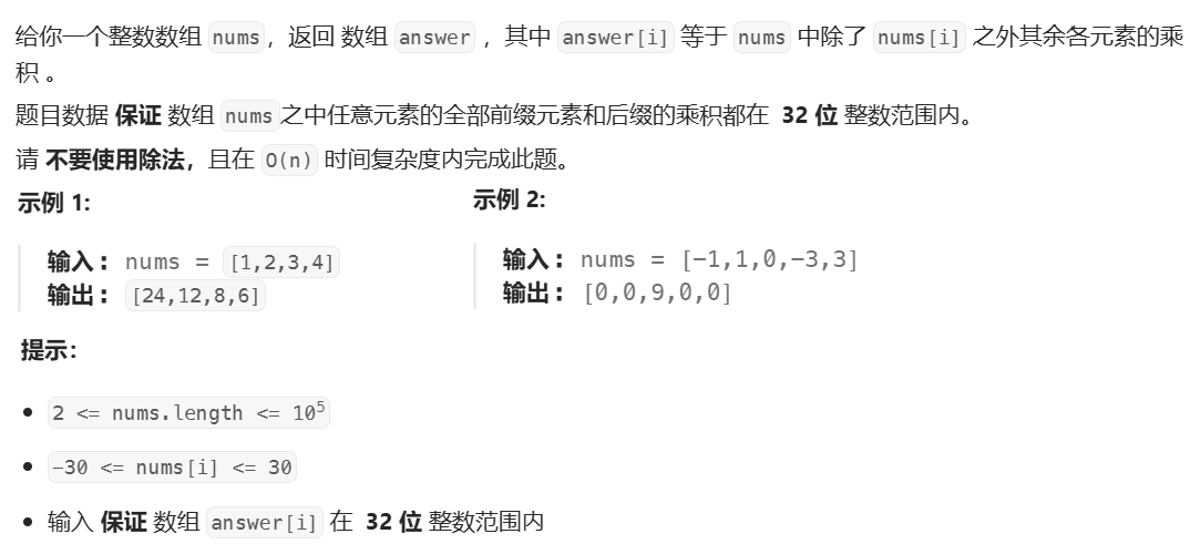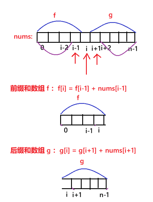 - 遍历nums,求出 i 的 f[i]*g[i] 的乘积,就是除了 i 外数组中所有元素的乘积,结果放在数组ret中,最后返回数组ret。