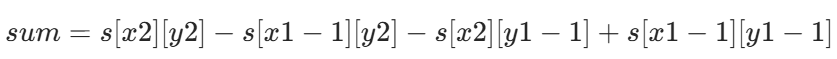 - 求任意矩阵和的公式:sum = sum[x2][y2] - sum[x2][y1-1] - sum[x1-1][y2] + sum[x1-1][y1-1]