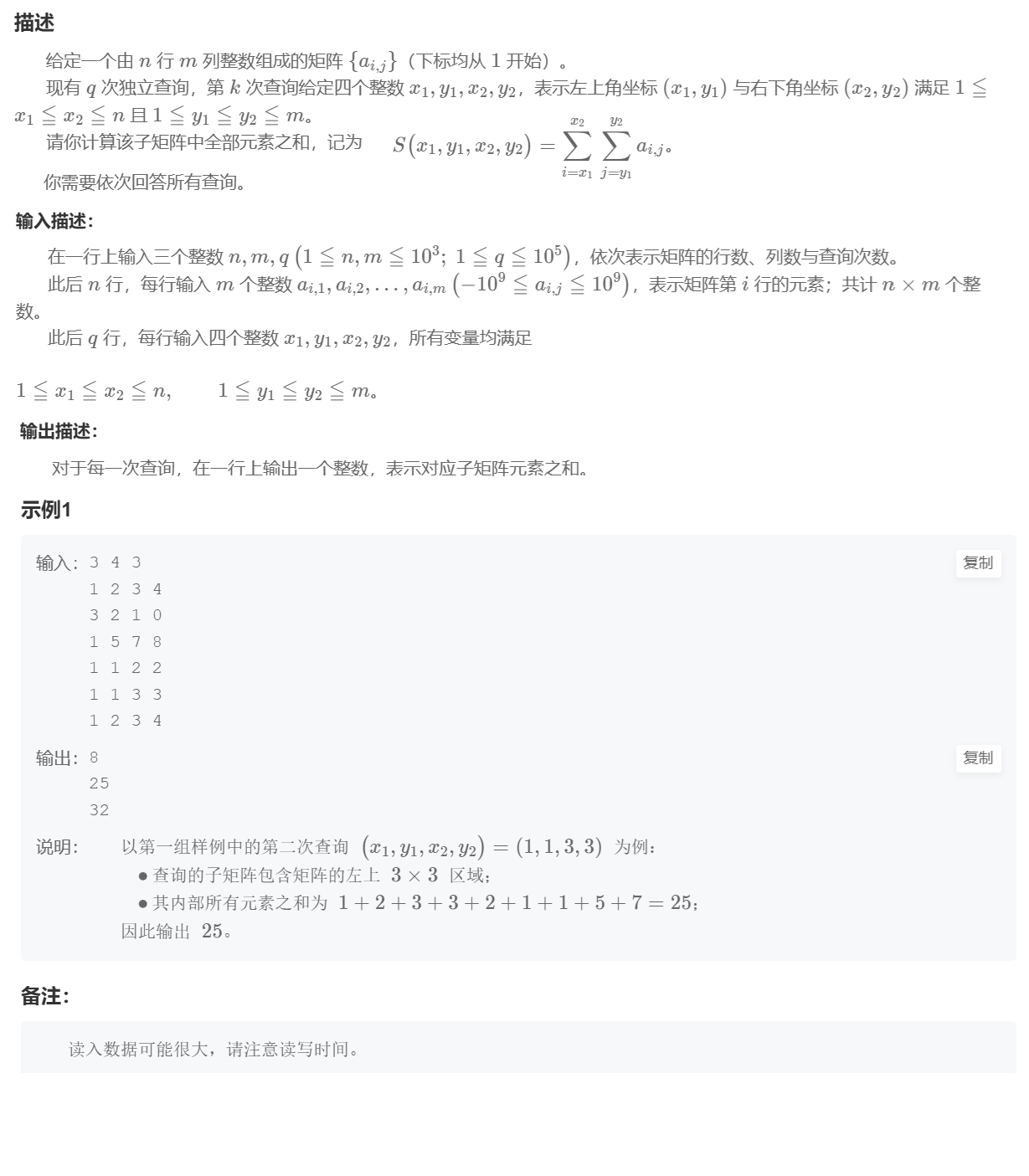 - 一维是求一段区间和,二维就是求一个子矩阵和。