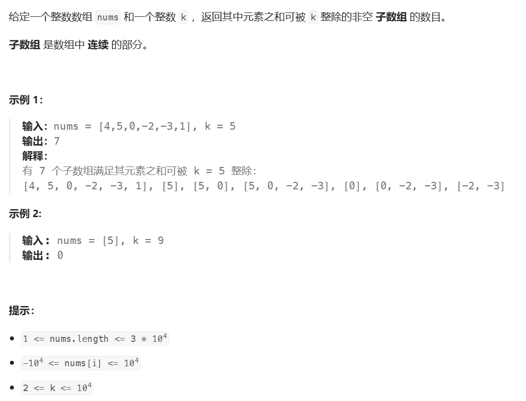 求出前 i 个元素的前缀和sum,假设 子数组x 是和可被 k 整除的子数组,那么要统计 子数组x 的个数,依然可以通过求出 和为 sum-x 的前缀和可以被 k 整除 的个数 而 间接求出 x 的个数: