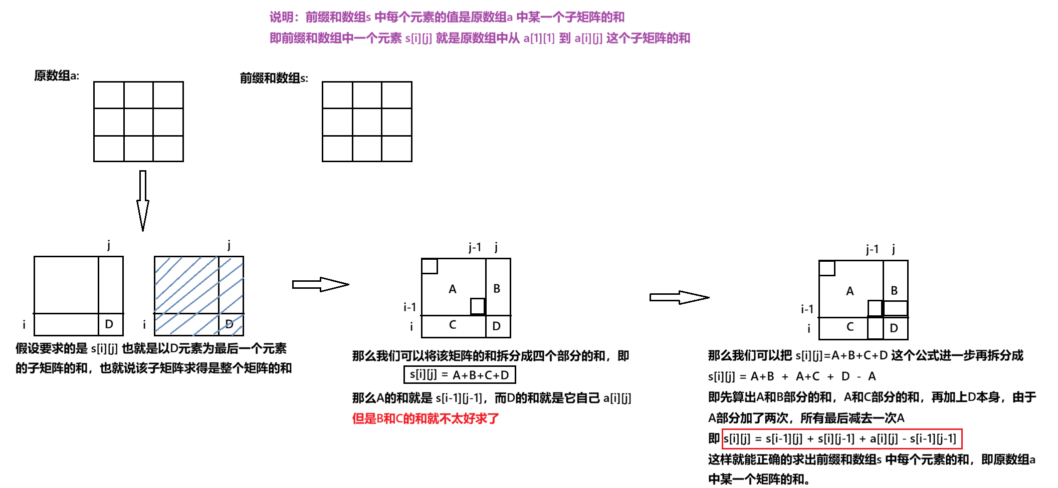 - 理解:s[i][j] 表示从 [1,1] 位置到 [i,j] 位置这段区间的所有元素之和,即前缀和数组中每个元素代表原数组 a 中的某个子矩阵的和。
