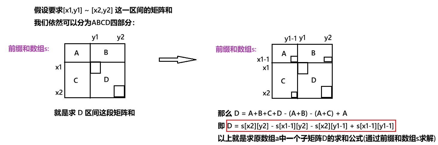 - 理解:前面一个公式的目的是为了求出前缀和数组中每个元素的值,而这个公式是为了求出原数组中的某一个子矩阵的和,要使用到求好的前缀和公式。