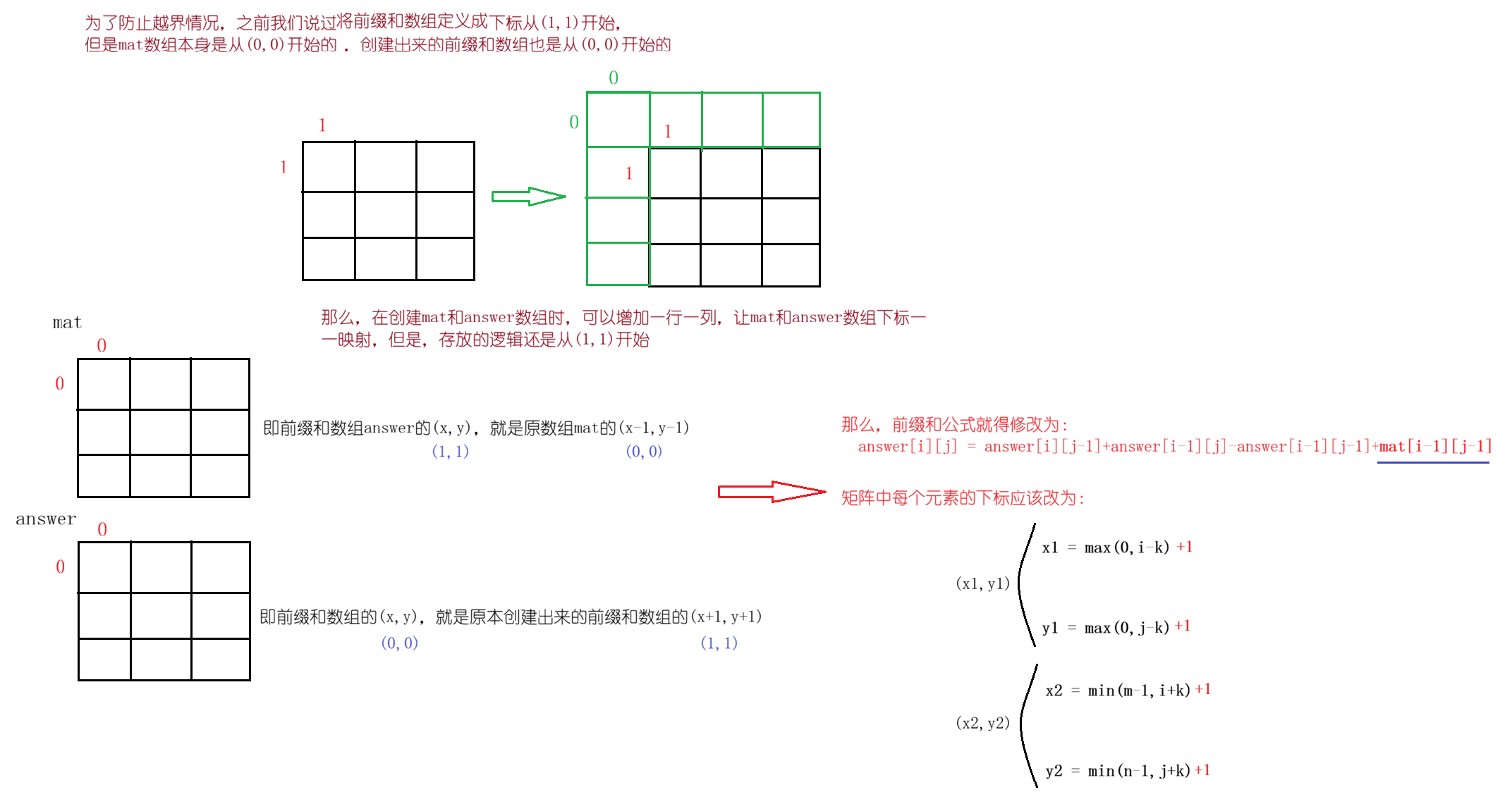 关于下标映射关系(就是最开始讲二维前缀和思路时,创建的前缀和数组大小+1):