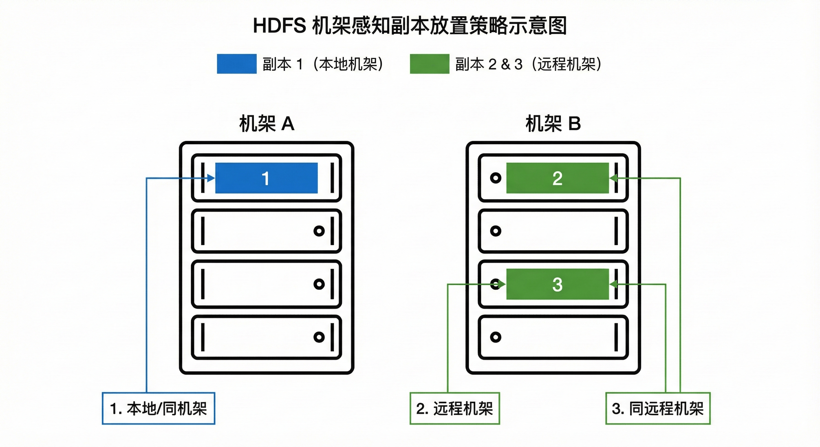 - 第 2 副本 :放置在与第 1 副本不同机架 的随机节点上。(防机架故障)