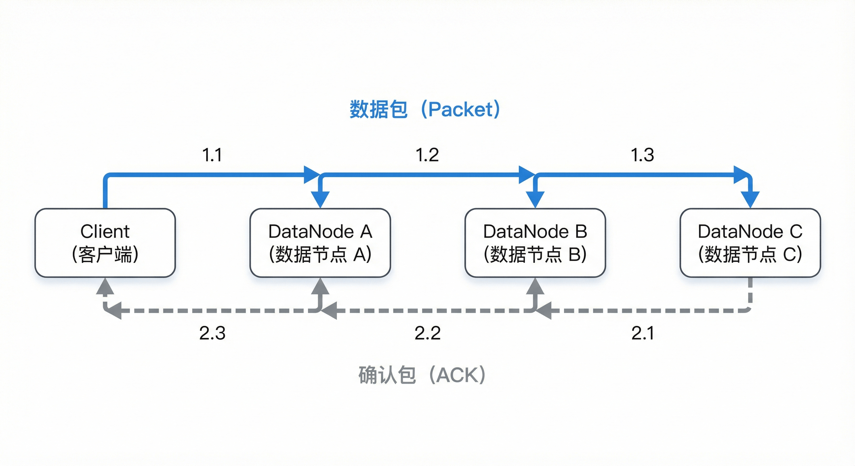 客户端将数据切分为 Packet(64KB),建立流式管道(Client -> A -> B -> C)。数据包在管道中依次传递,而确认包(ACK)则逆序回传。只有当所有副本都确认写入成功,该 Block 才被视为已提交。 - 租约机制(Lease) :