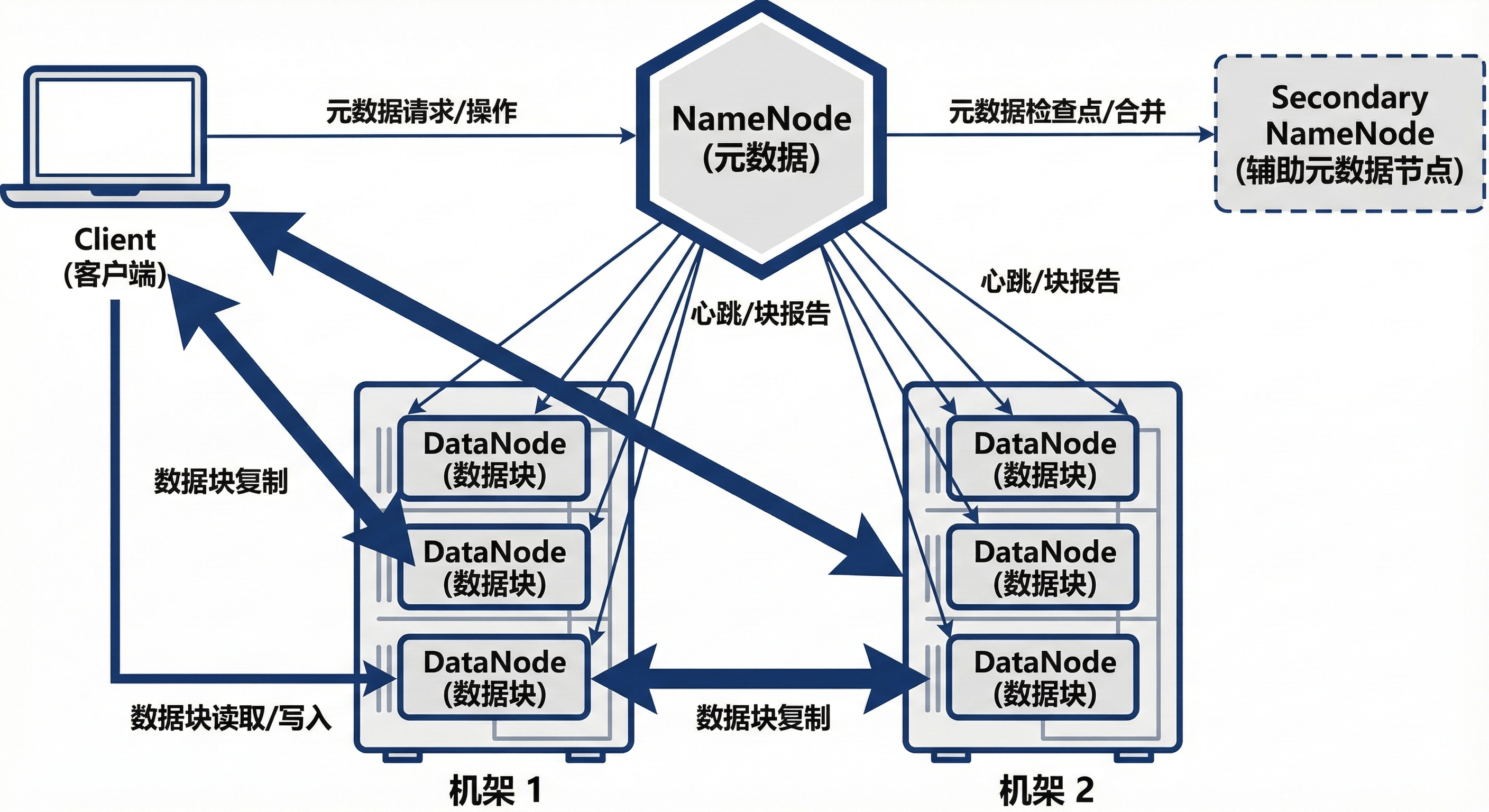 - 元数据管理:维护文件目录树、文件到数据块(Block)的映射关系。这些数据驻留在内存中以提供高性能访问。