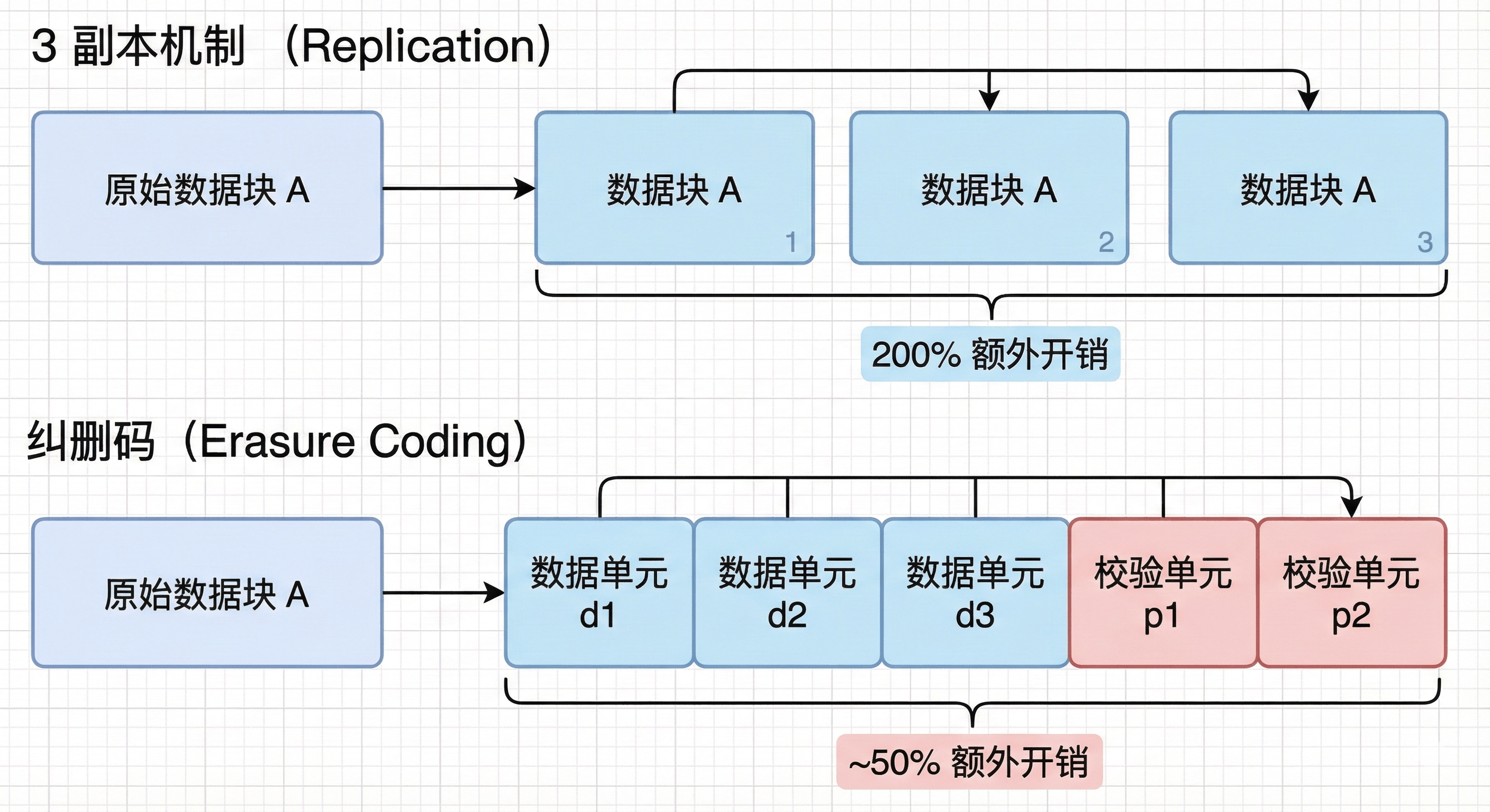 - 优势 :将存储冗余度从 200% (3副本)降低到 约 50%(如 RS-6-3 编码),显著节省存储成本。
