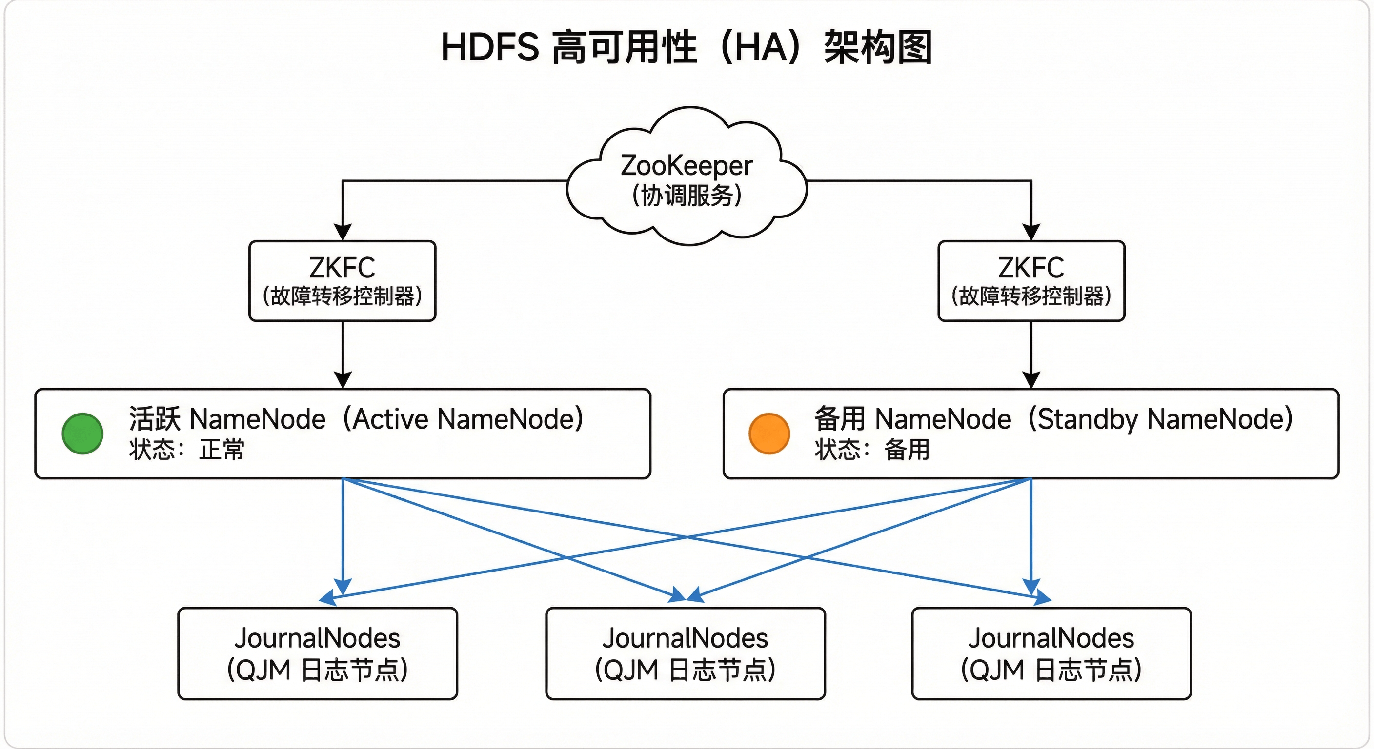 - 故障自动切换 :利用 ZooKeeper 和 ZKFC (ZK Failover Controller) 监控节点状态。当 Active 宕机时,ZKFC 自动将 Standby 提升为 Active。
