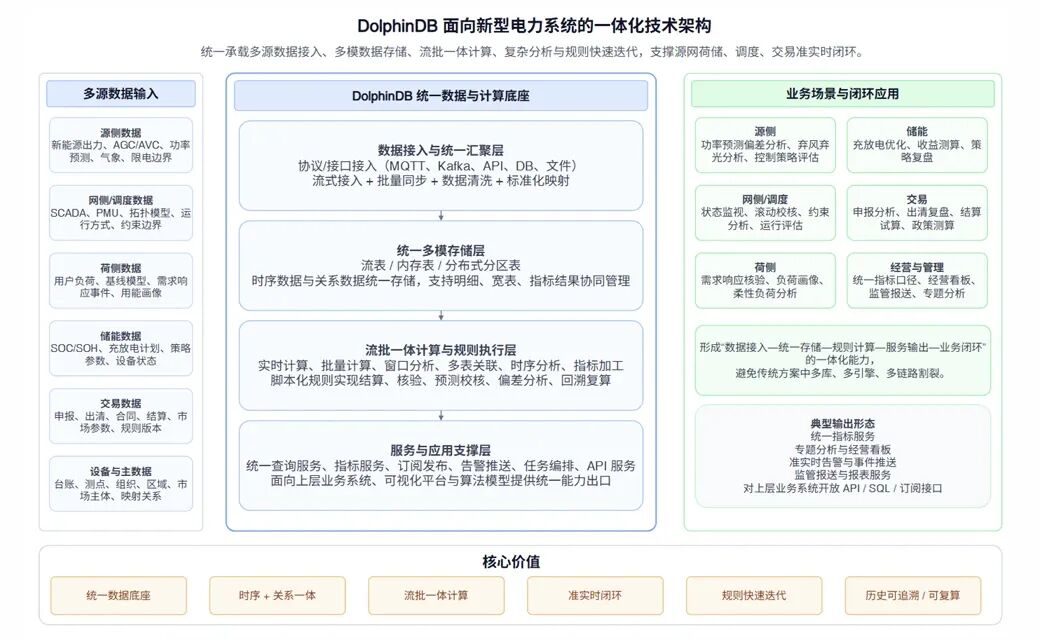 DolphinDB 的定位是电力数据底座加实时分析引擎。从数据源接入(SCADA、电采系统、气象、交易结算等),到流数据接入和 API 网关统一汇聚,再到分布式存储、流计算、复杂事件处理引擎、规则引擎、机器学习模块和 2000+ 内置函数,最终支撑源侧监视、网侧感知、荷侧聚合、交易结算四大场景。