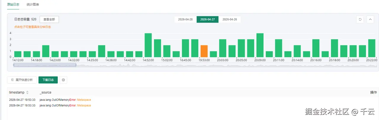 - 对比应用日志,元空间内存溢出 (