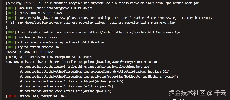 - 关键启示:Arthas本身运行需要JVM空间,此错误说明JVM的元空间(Metaspace)已满,无法再加载任何类(包括Arthas的Agent)。